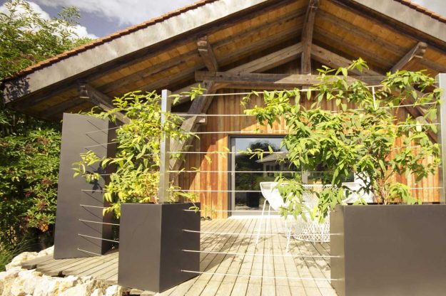 Une clôture originale ! Prévues pour des plantes grimpantes, les bacs sont percés sur toute leur hauteur pour permettre la fixation des câbles d’accroche.