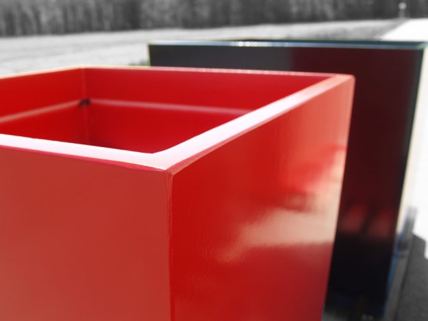 Jardinières laquées BLANC PUR et ROUGE CARMIN. 2 bacs CUBIQUES ICC de grands format : 80cm3 et 1m3 associé à un bacs CARRE BAS ICB de dimensions 100×100 H20 cm.