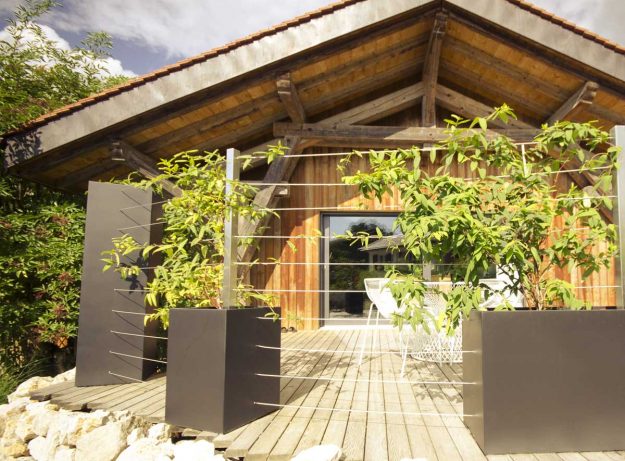 Une clôture originale ! Prévues pour des plantes grimpantes, les bacs sont percés sur toute leur hauteur pour permettre la fixation des câbles d’accroche.