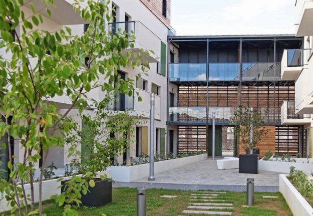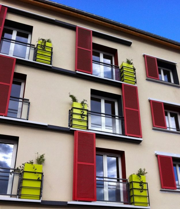 Cet immeuble situé à Saint-Romain-Le-Puy a été totalement réhabilité : Les jardinières Image’In en façade apportent modernisme et contraste de par ce choix de couleur !