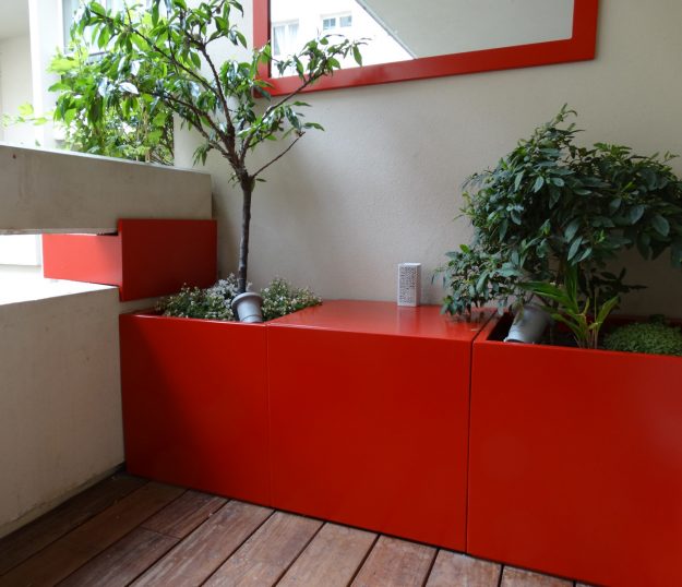Un ensemble unique composé de Bacs à fleurs, Banquette, Rangement … Une étude complète et personnalisée a été réalisée pour répondre à cette problématique globale d’aménagement de cette loggia parisienne.
