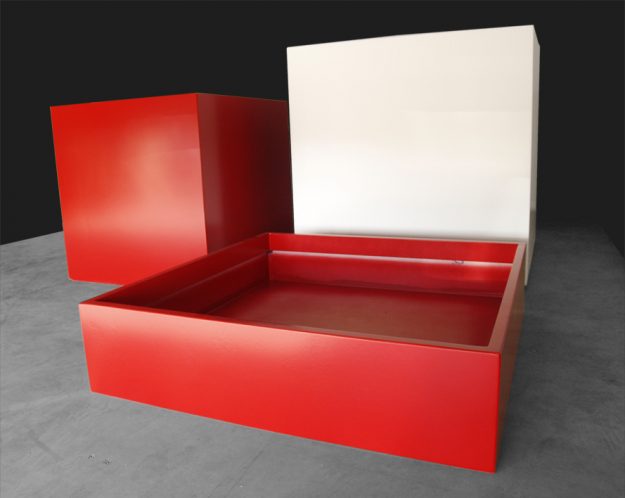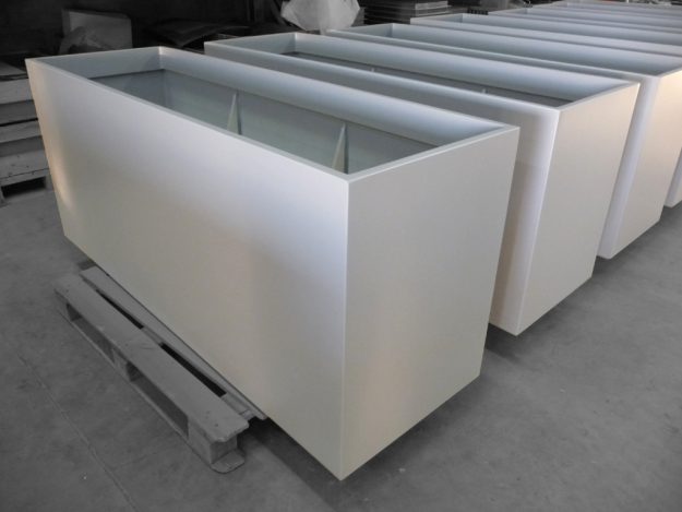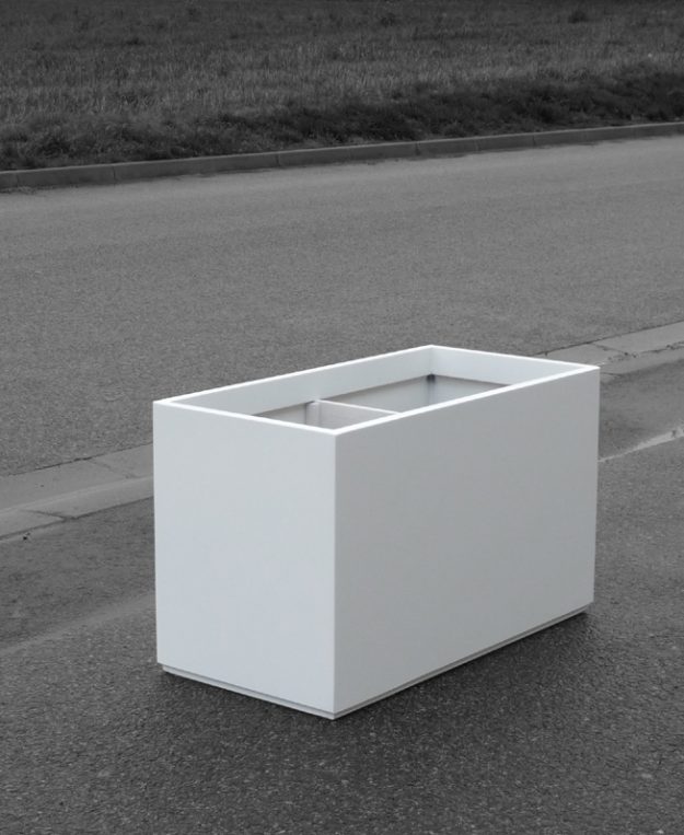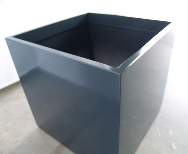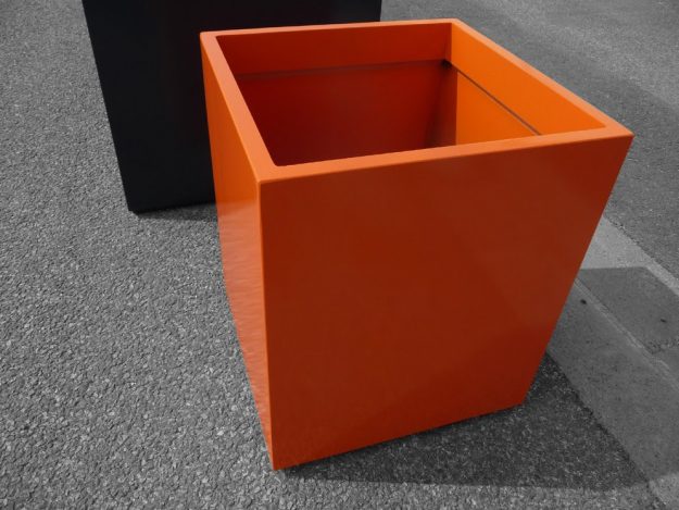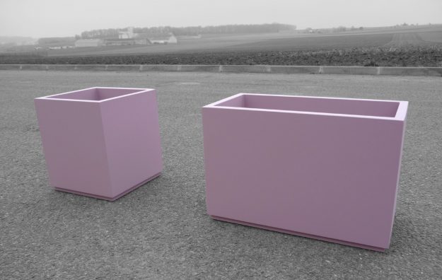 Jardinière pyramidale sur mesure particulièrement évasée. De dimensions moyennes (65cm3), ces bacs peuvent accueillir des végétaux de taille respectable sans encombrement excessif. Référence : IPE 65 – Jardinière Pyramide Evasée – Violet signalisation RAL 4008