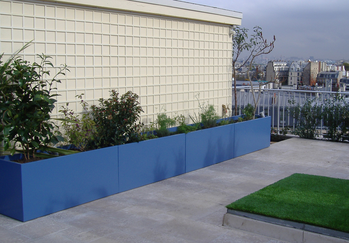 Set of planters made to measure for the fitting out of a magnificent roof terrace in Paris, with a view on the Invalides and the Eiffel Tower.