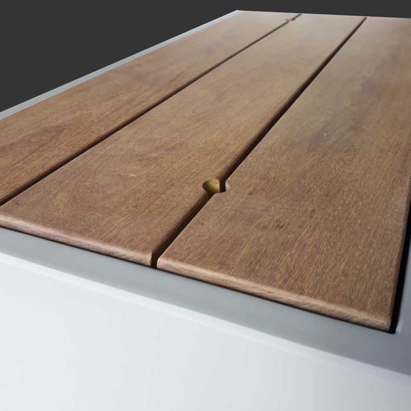 The wooden top is generally offered in exotic wood type IPE for example. These species are chosen for their stability. This use requiring low consumption, we choose this precious wood for its durability which remains a major asset to guarantee durability. Closure solutions with French production wood, such as Douglas, are however feasible.