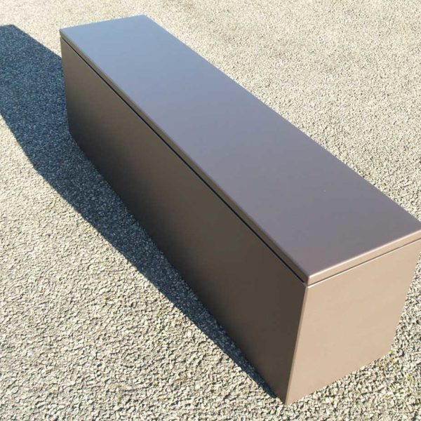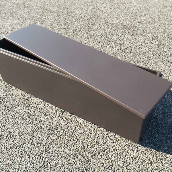 The orientation of the wooden slats can also be longitudinal or transverse depending on the desired rendering. - The aluminum sheet metal cover : ideal solution for the storage of sensitive products requiring a waterproof chest. This closure solution more expensive nevertheless has the advantage of being light and can also be used as a seat to transform your chest into a garden bench.