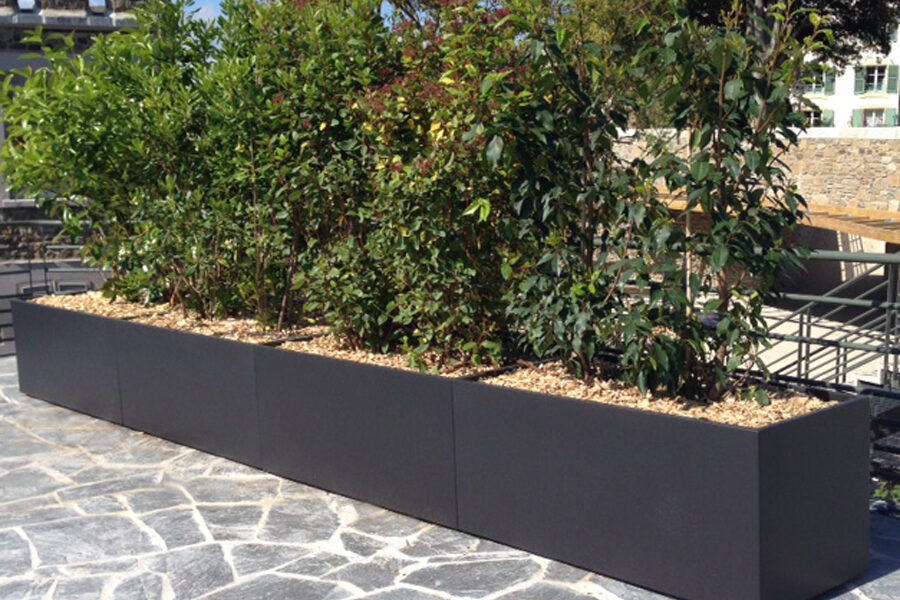 To cover a long length of plant containers, Image’In offers its custom made pots with side walls lowered to form a linear. The soil surface is thus uniform on the whole length over these large assemblies.