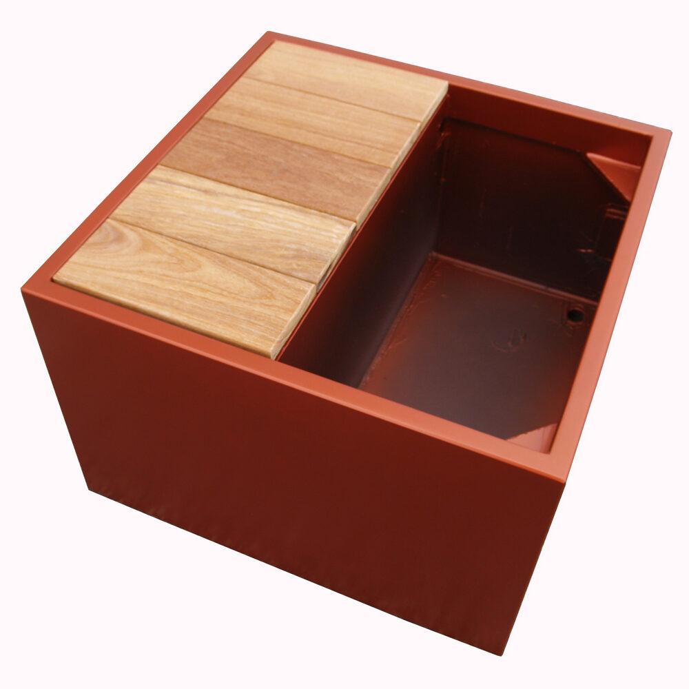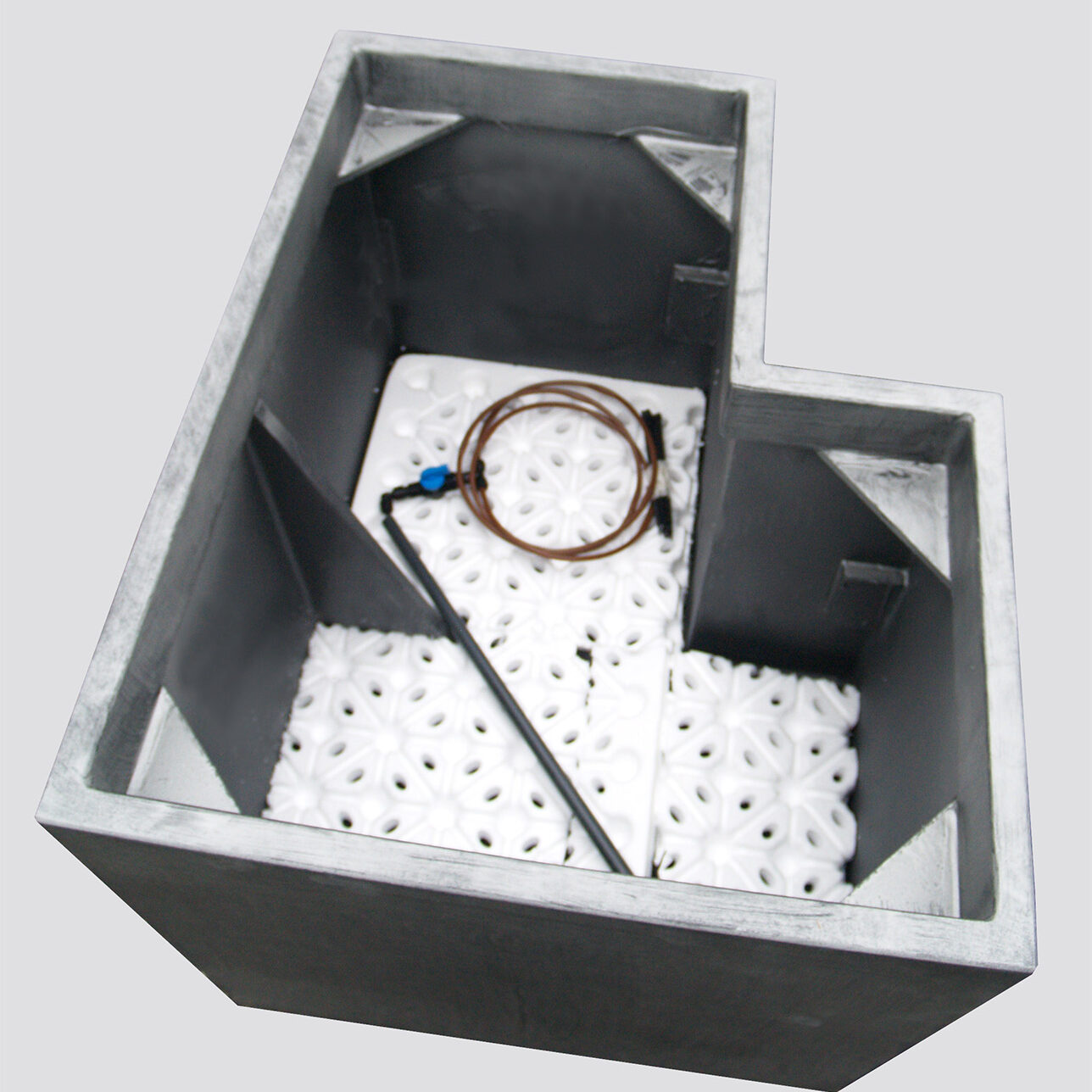 Dans sa configuration classique, le fond est drainant. Une perforation de la base permet l’évacuation du trop plein d’eau sous le bac. Toutefois, d’autres configurations sont possibles en options :